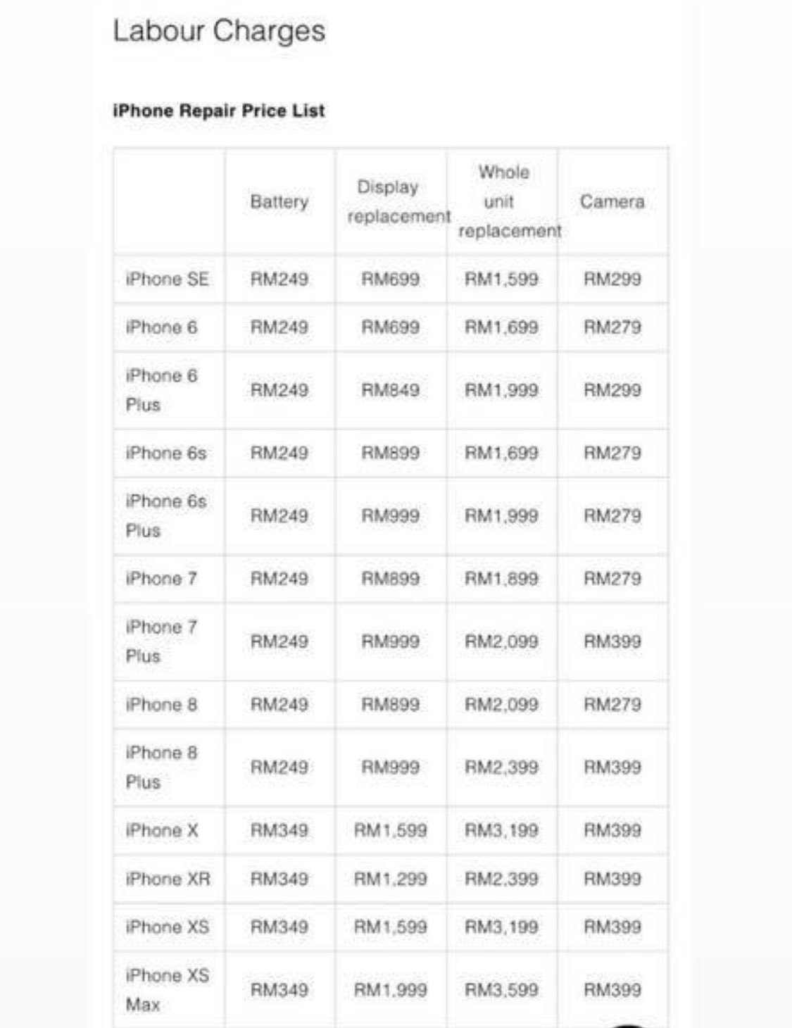 For iPhone X iPhone XR iPhone Xs iPhone Xs Max iPhone 11 iPhone 11 Pro and iPhone 11 Pro Max price is RM380. Kuala Lumpur Estimated Arrival 1-3 working days. Inclusive of labor charges.